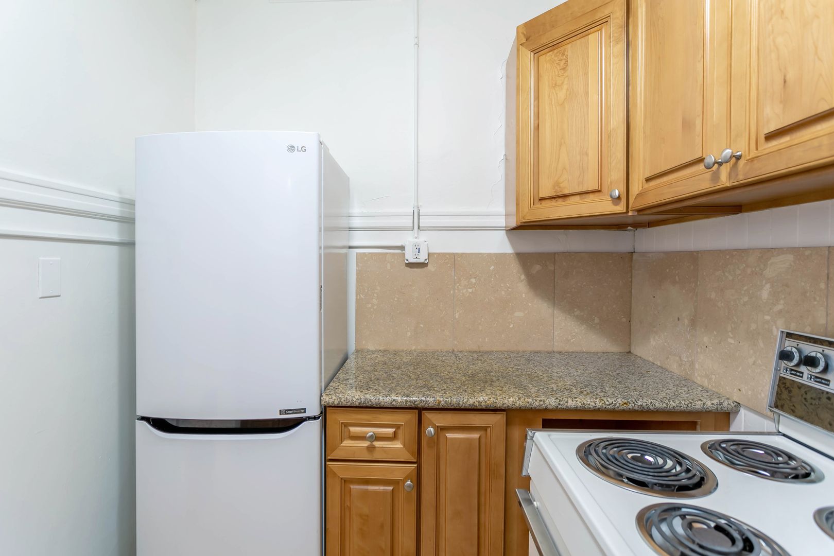 This 3rd floor studio apartment boasts hardwood floors throughout, offering a classic and durable foundation for the living space. It features essential appliances such as a fridge and stove, ensuring convenience for daily living.